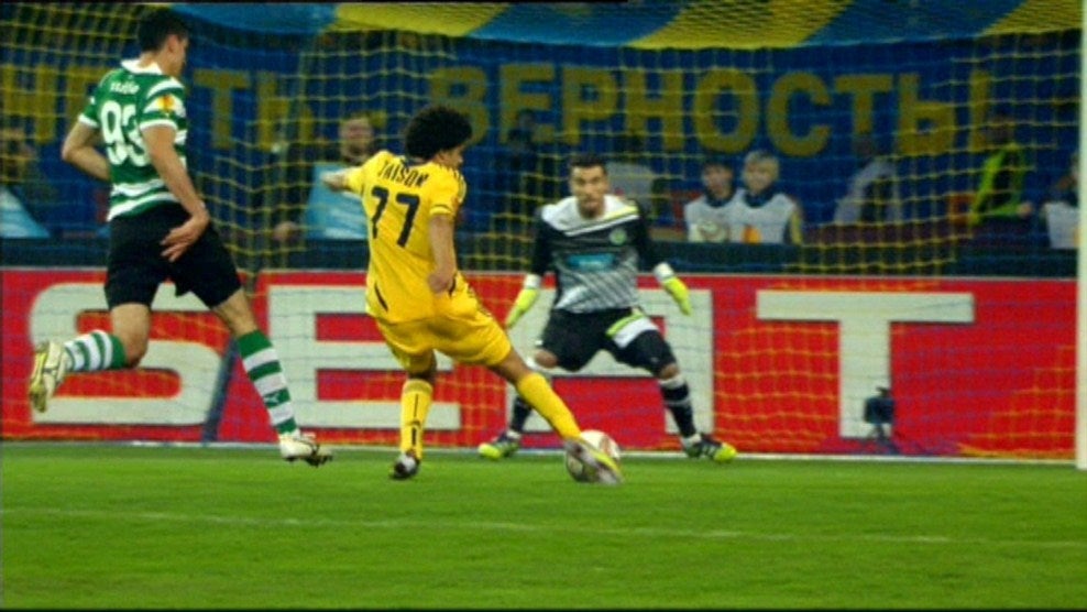 28' - Rui Patrício nega o primeiro ao Metalist! Cleiton Xavier recupera uma bola que a defesa do Sporting não consegue limpar da melhor maneira e, de ângulo difícil, tenta surpreender o guarda-redes leonino mas Patrício manda para canto.