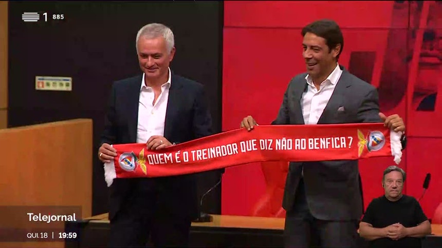 José Mourinho já foi apresentado no Benfica. O técnico regressa à Luz 25 anos depois. Diz que agora é o treinador de um dos maiores clubes do mundo. Rui Costa nega que esta contratação seja a pensar nas eleições.