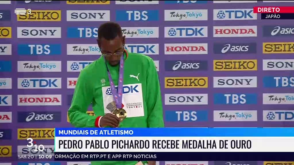 O atleta português recebeu a medalha de ouro pelo triplo salto nos Mundiais de atletismo que estão a decorrer em Tóquio.