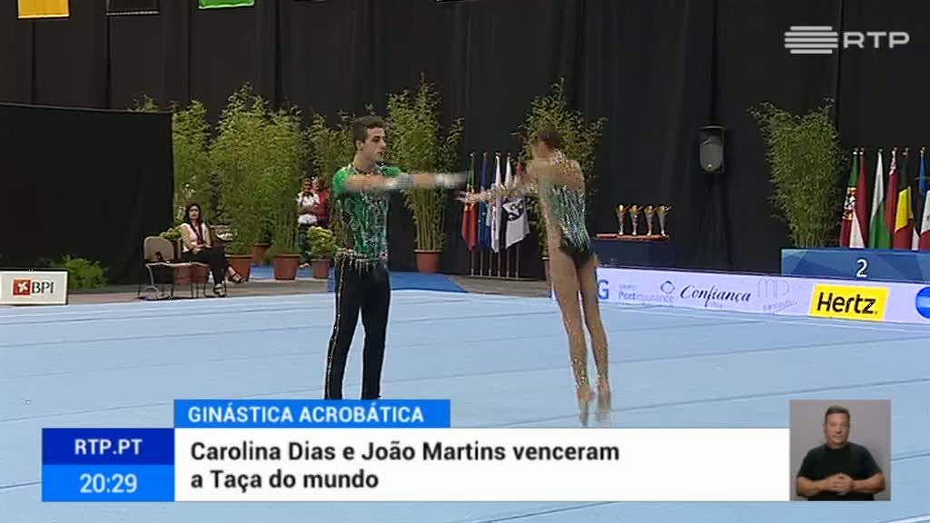 Desporto Par português venceu taça do mundo de ginástica acrobática João Martins e Carolina Dias venceram a taça do mundo de ginástica acrobática. RTP / VER MAIS O par misto português, que já liderava o circuito mundial, venceu a etapa que se realizou em Lisboa e subiu ao lugar mais alto do pódio. PUB
