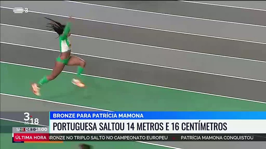 Patrícia Mamona conquistou o bronze no Triplo Salto. É a terceira medalha para Portugal, nos Europeus de Pista Coberta, em Istambul, depois do ouro de Pedro Pichardo, no triplo, e de Auriol Dongmo, no Lançamento do Peso.