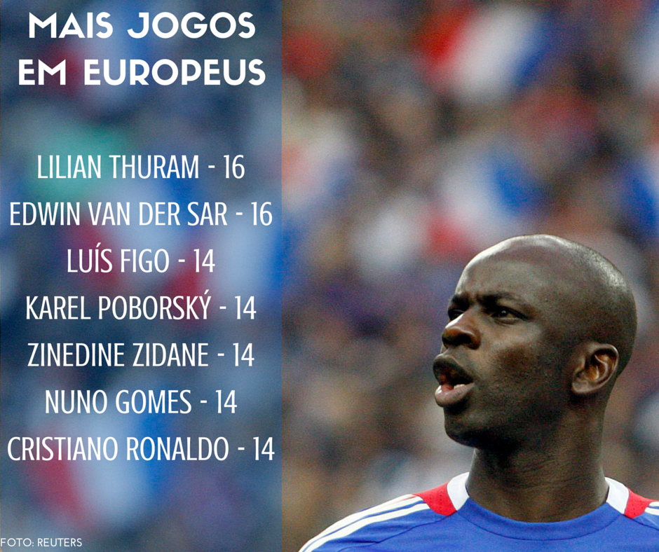No Euro 2016, CR7 prepara-se para se tornar no jogador com mais jogos alguma vez realizados em Europeus. Lilian Thuram (França) e Edwin Van Der Sar (Holanda) lideram (por agora) a lista com 16 partidas cada. Cristiano Ronaldo está a apenas a dois jogos de igualar duas grandes figuras do futebol europeu.