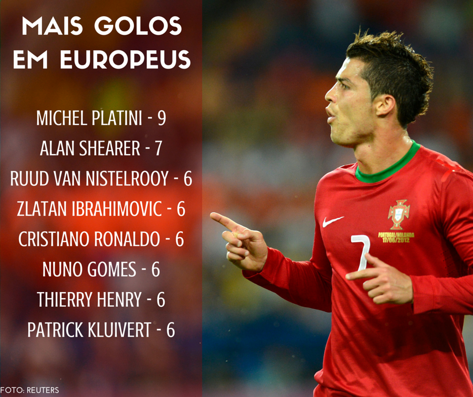 Cristiano Ronaldo já leva meia-dúzia nos três Europeus em que participou. Grécia, Holanda (por três vezes) e República Checa (por outras duas) já sofreram golos do internacional português e a grande estrela francesa está a três golos de ser igualado.