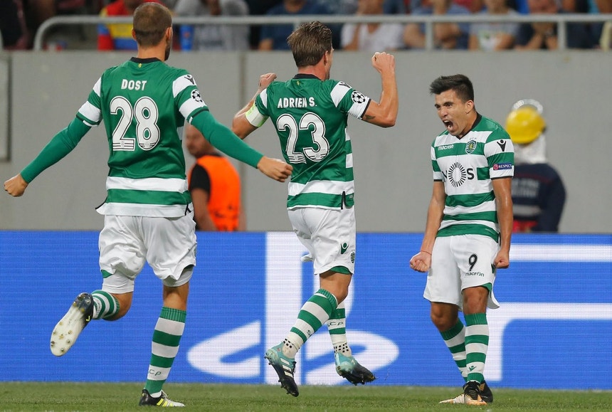 Está feito. O Sporting cumpriu positivamente este play-off da Liga dos Campeões ao vencer claramente o Steaua por 5-1, em Bucareste, após o nulo em Alvalade, e estará quinta-feira entre as equipas sorteadas na fase de grupos da competição. Na Arena de Bucareste, o Sporting chegou ao intervalo com um empate a uma bola, mas na segunda metade do encontro, os 'leões' impuseram-se e, no espaço de cinco minutos, marcaram por duas vezes, deixando os romenos sem forças para lutarem nesta qualificação. Doumbia foi a jogo logo de início e foi ele o autor do primeiro golo aos 13 minutos. Aos 20 surgiu o golo do Steaua por Júnior Maranhão. Aos 60 marcou Marcos Acuña, após um excelente passe de Bruno Fernandes, e quatro minutos depois, Gelson Martins deu a tranquilidade aos adeptos. Ainda faltava Bas Dost, entrou na segunda parte e fez o gosto ao pé, com o 4º golo, decorria o minuto 75. A finalizar, Battaglia ainda fez o quinto aos 87. Portugal garante assim a presença de três clubes na prestigiada prova da UEFA, um apuramento que garante para Alvalade, e no imediato, uma receita de quase 15 milhões de euros. (Foto: EPA)
