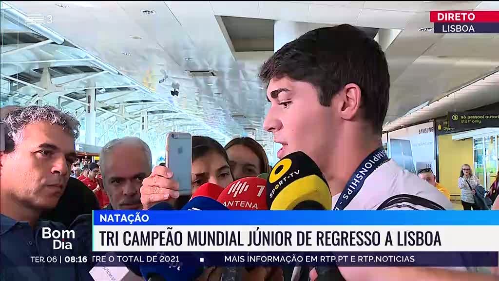 Diogo Ribeiro já regressou a Portugal. O tri-campeão mundial júnior de natação foi recebido no aeroporto de Lisboa pela equipa, amigos e família. À comunicação social admitiu que os resultados agora conseguidos é uma "boa motivação para trabalhar para o futuro".