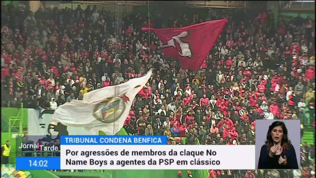 Desporto Tribunal condena Benfica O Supremo Tribunal Administrativo condenou o Benfica a pagar uma multa de 8.645 euros por agressões de membros da claque No Name Boys a agentes da PSP. RTP / VER MAIS PUB