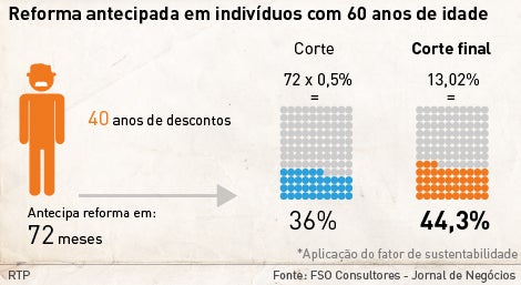 Ao solicitar a reforma aos 60 anos, antecipa a reforma em 72 meses, o que vai equivaler a um corte inicial de 36 por cento.Fator de sustentabilidade: