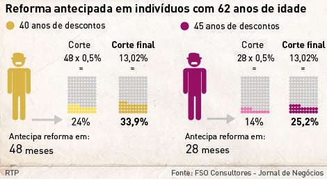 Com a mesma idade e 45 anos de descontos, o corte de 0,5 será aplicado a 28 meses, em vez de 48 meses. Já com a aplicação do fator de sustentabilidade, estará em causa uma redução de 25,2 por cento.