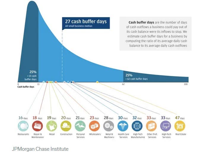 Um estudo conduzido pelo instituto norte-americano analisou, em 2016, as contas de 597 mil pequenas empresas no período entre fevereiro e outubro do ano anterior, baseando-se na “almofada de capital” de cada uma, ou seja, o montante que uma empresa possui de reserva para se manter ativa na eventualidade de deixar de receber dinheiro.