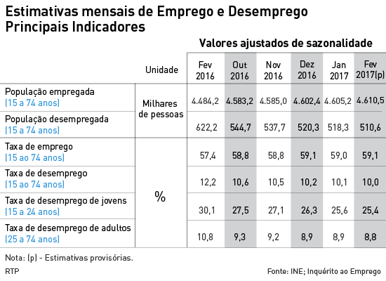 Já a estimativa provisória da taxa de desemprego de fevereiro de 2017 prevê uma nova descida para os dez por cento, revelam os números do INE (Instituto Nacional de Estatística) publicados esta sexta-feira.