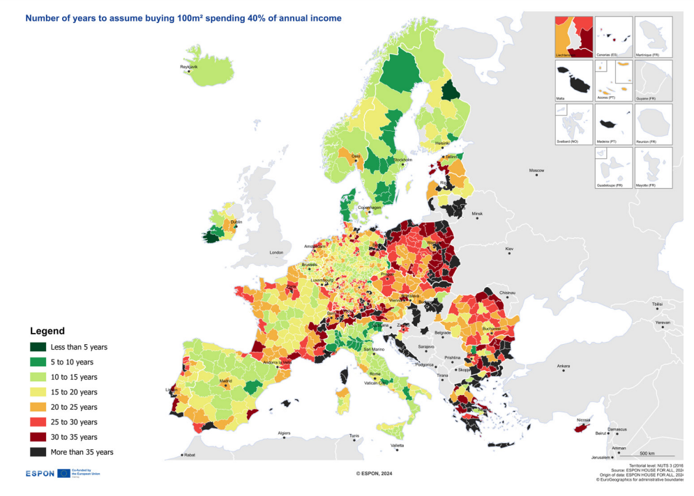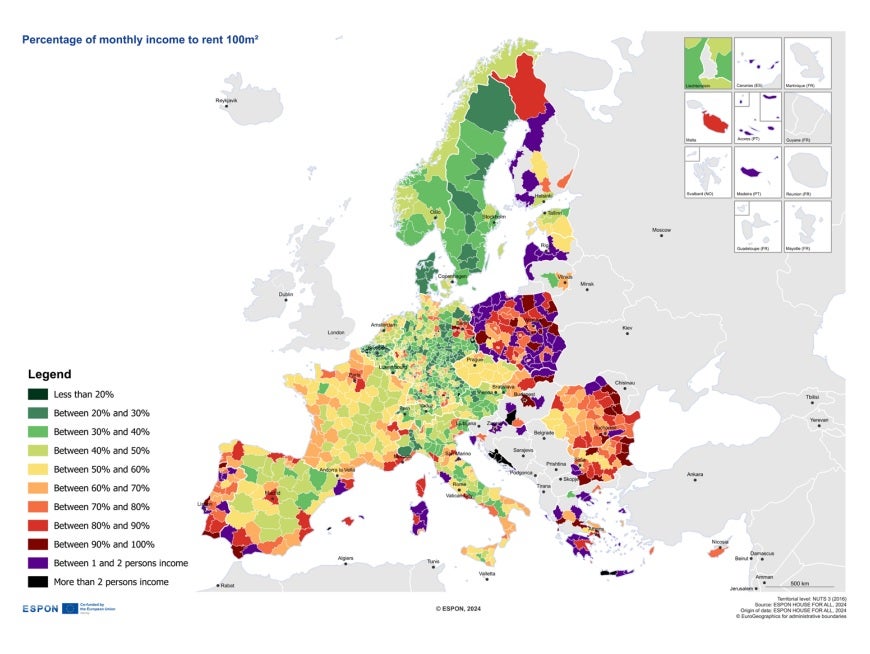 Para fazer este indicador teórico, o Observatório em Rede do Ordenamento do Território Europeu olhou para as regiões europeias (em NUTS III) e comparou os preços de vários anúncios online, verificados no dia 7 de março de 2024, com o PIB per capita (rendimento por pessoa).