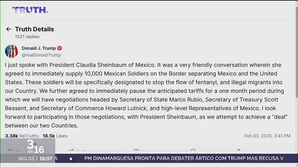 A aplicação de tarifas comerciais de 25 por cento decididas por Donald Trump foi adiada por um mês. O anúncio foi feito pela presidente mexicana e confirmado por Trump na rede Truth Social. Claudia Sheinbaum comprometeu-se a enviar 10 mil militares para a fronteira para controlar a imigração e combater o tráfico de droga.