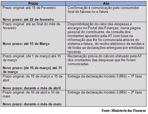 Quanto à entrega da primeira fase da declaração do modelo 3 do IRS (trabalhadores dependentes e pensionsitas), cujo prazo original era de 15 de março a 15 de abril, o Governo adiou a entrega para "durante o mês de abril".