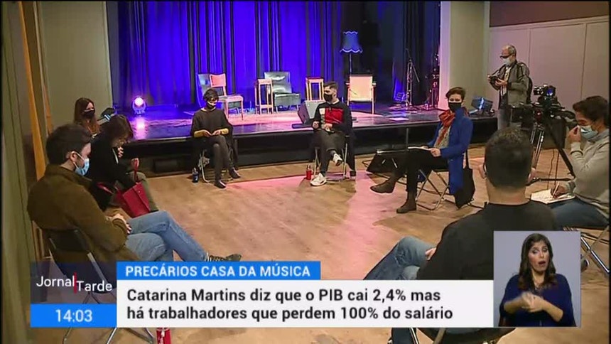 Catarina Martins diz que o PIB cai 2,4 por cento... mas há trabalhadores que perderam o salário a 100 por cento. Esta manhã, a coordenadora do Bloco de Esquerda esteve reunida com funcionários da Casa da Musica do Porto que estão a recibo verde e deixaram de receber ordenado há dois meses.