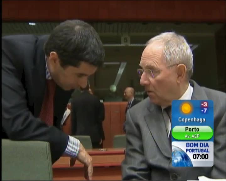 As imagens da conversa em Inglês entre Wolfgang Schäuble e Vítor Gaspar foram divulgadas na noite de quinta-feira pela TVI. Na antecâmara da reunião que os ministros das Finanças da Zona Euro dedicaram ao dossier grego, o governante alemão assegurou que o Executivo de Angela Merkel estará preparado para um eventual “ajustamento do programa português”, uma vez “tomadas as grandes decisões sobre a Grécia”. “Agradecemos muito”, respondeu o ministro português. “De nada”, devolveu Schäuble.“Nem mais tempo, nem mais dinheiro”