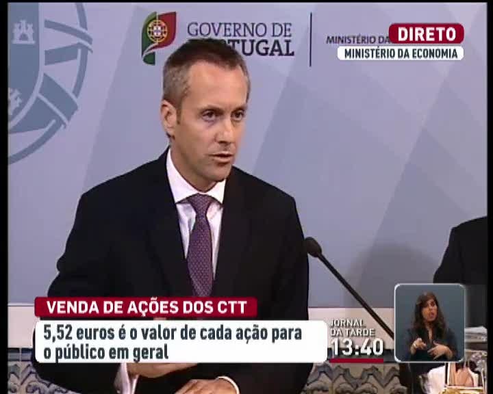 O governo veio justificar ter optado pelo preço máximo, para a venda das acções dos CTT. Para o público em geral ficam a cinco euros e cinquenta e dois cêntimos cada. Para os trabalhadores, que beneficiam de um desconto de cinco por cento, o valor desce para os cinco euros e vinte e quatro cêntimos.
