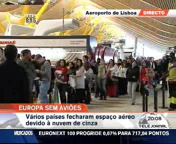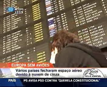 As nuvens de cinza provenientes de um vulcão sob o glaciar islandês Eyjafjallajokull mantêm encerrados vários aeroportos na Europa. Dados da Eurocontrol revelam que até à meia-noite de quarta-feira foram afectados mais de quatro mil voos com destino ou partida de 15 países europeus, e hoje deverão ser cancelados mais seis mil. Hoje, em Portugal, pelo menos 84 voos foram cancelados nas primeiras horas.