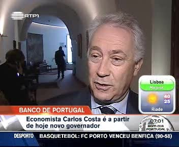 O economista Carlos Costa assume esta segunda-feira, no Ministério das Finanças, o cargo de governador do Banco de Portugal, sucedendo a Vítor Constâncio à frente do organismo de supervisão do sector financeiro. Nomeado pelo Governo a 23 de Abril, o ex-vice-presidente do Banco Europeu de Investimento, com 60 anos, é empossado pelo titular da pasta das Finanças, Teixeira dos Santos, no salão nobre do Ministério.