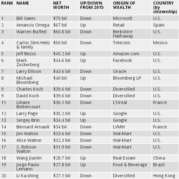 O fundador da Microsoft voltou a ser considerado o homem mais rico do mundo pela revista Forbes. Bill Gates ocupa a primeira posição pelo terceiro ano consecutivo e pela 17ª vez nos últimos 22 anos. Marck Zuckerberg ocupa pela primeira vez um lugar nos dez primeiros, ao quadruplicar o valor da sua fortuna em relação a 2015.