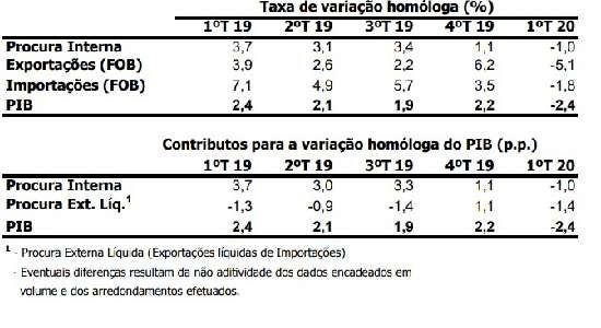 O Produto Interno Bruto (PIB) diminuiu 2,4 por cento em volume no primeiro trimestre de 2020, quando comparado com o mesmo período do ano passado, após o aumento de 2,2 no trimestre anterior.