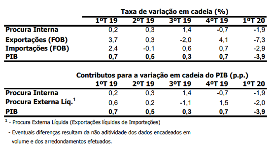 Comparativamente com o último trimestre de 2019, o PIB diminuiu 3,9 por cento em termos reais. A variação em cadeia no trimestre anterior (quarto trimestre de 2019) tinha sido um aumento de 0,7 por cento.
