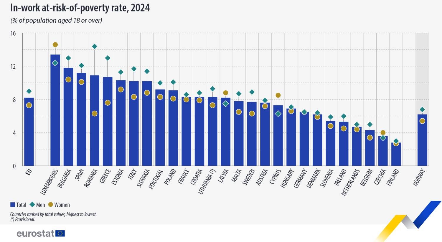 Em 2024, 8,2% das pessoas com 18 anos ou mais que declararam estar empregadas (por conta de outrem ou por conta própria) na UE estavam em risco de pobreza.