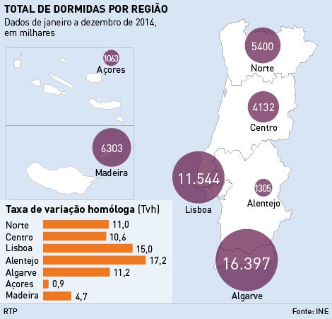 O número de dormidas de residentes em Portugal atinge valores que não se viam desde 2010. De um total de 46,1 milhões de dormidas, os portugueses representaram 13,8 milhões de dormidas, um aumento de 13 por cento face a 2013.