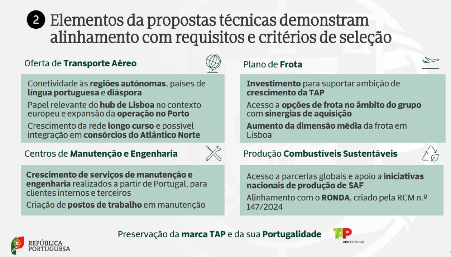 O Governo considera que as duas propostas em causa seguem as ideias do executivo na oferta de transporte aéreo, no plano de frota, na questão dos centros de manutenção e engenharia, e produção de cmbustiveis sutentáveis.