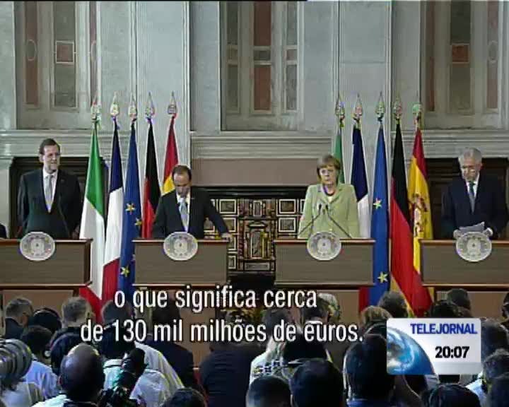 Italia, Alemanha, França e Espanha querem destinar um por cento do Produto Interno Bruto para estimular a economia. Numa mini-cimeira europeia realizada em Roma, os líderes das quatro maiores economias da Zona Euro chegaram a acordo sobre um plano de crescimento. A verba anunciada é de130 mil milhões de euros.
