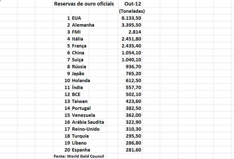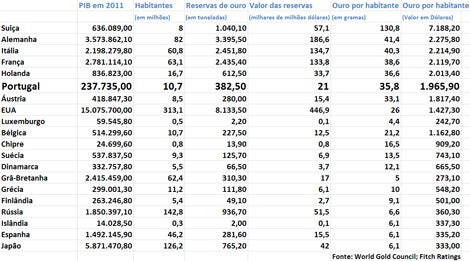 De acordo com os dados do World Gold Council, citados pelo Diário Económico, Portugal é o 12.º país do mundo com mais ouro (382,5 toneladas) e é sobretudo, entre os países considerados desenvolvidos, aquele em que as reservas são maiores em proporção às dimensões da Economia (10,3 por cento).