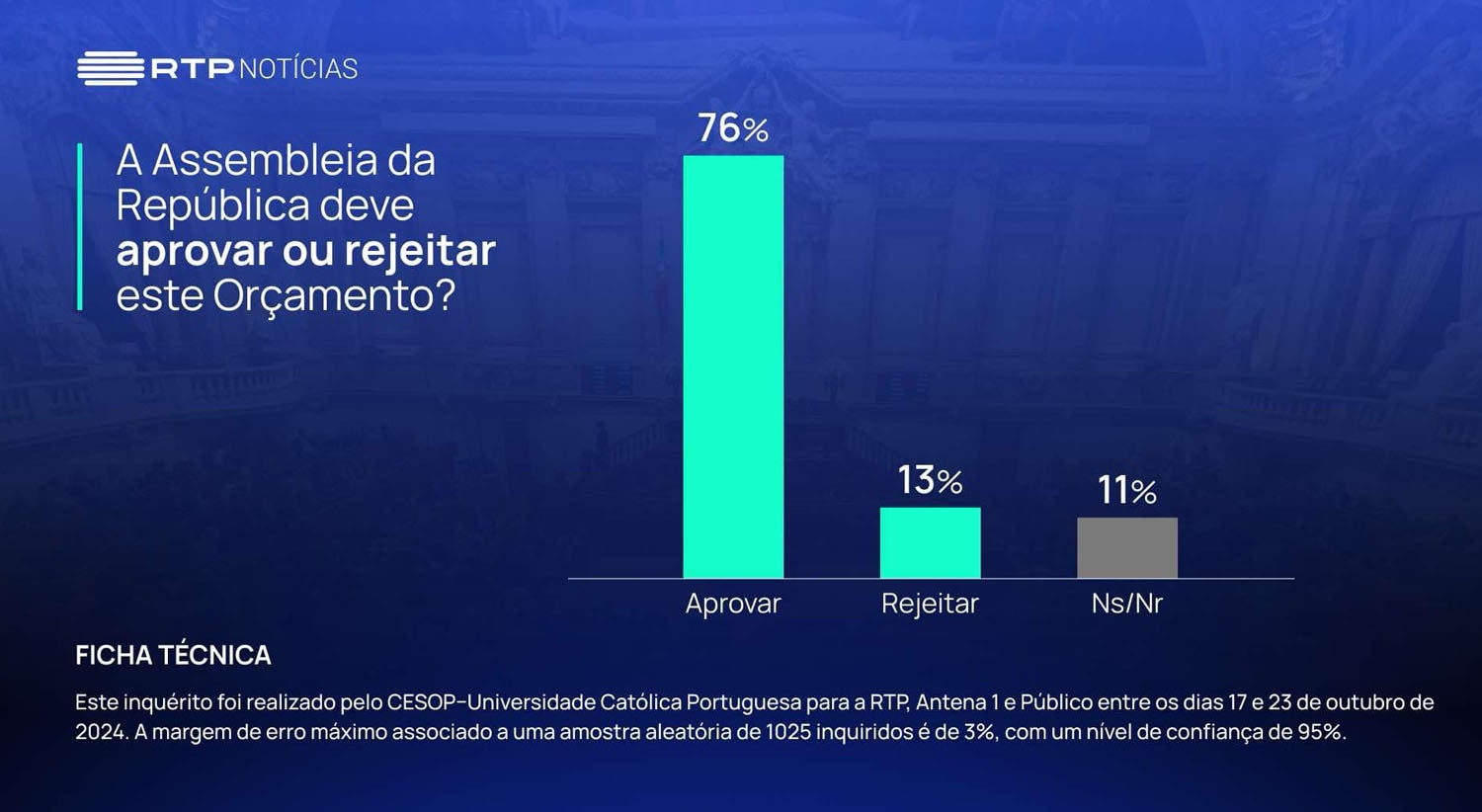 Uma larga maioria de três em cada quatro portugueses (76%) quer ver o Orçamento para 2025 aprovado pela Assembleia da República, contra apenas 13% que optariam pela rejeição, segundo o estudo do Centro de Sondagens da Universidade Católica para a RTP, Antena 1 e Público. Em caso de chumbo, a sondagem aponta a responsabilidade ao primeiro-ministro, Luís Montenegro, apesar de considerar simultaneamente que é Montenegro quem mais está a trabalhar para a viabilização do documento. Clara é também a rejeição dos portugueses de novas eleições em caso de chumbo.