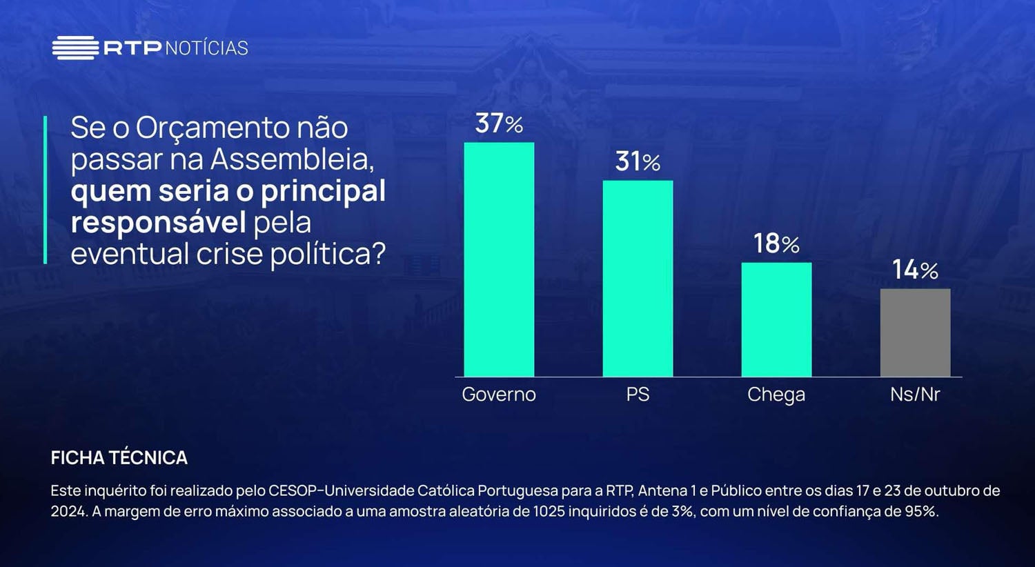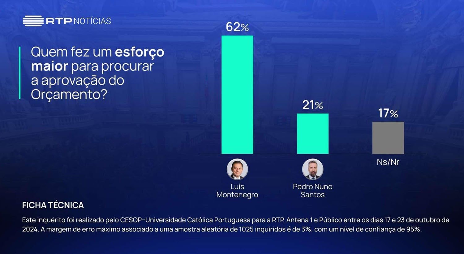 Este inquérito foi realizado pelo CESOP–Universidade Católica Portuguesa para a RTP, Antena 1 e Público entre os dias 17 e 23 de outubro de 2024. O universo alvo é composto pelos eleitores residentes em Portugal. Os inquiridos foram selecionados aleatoriamente a partir duma lista de números de telemóvel, também ela gerada de forma aleatória. Todas as entrevistas foram efetuadas por telefone (CATI). Os inquiridos foram informados do objetivo do estudo e demonstraram vontade de participar. Foram obtidos 1025 inquéritos válidos, sendo 45% dos inquiridos mulheres. Distribuição geográfica: 31% da região Norte, 19% do Centro, 34% da A.M. de Lisboa, 8% do Alentejo, 4% do Algarve, 2% da Madeira e 2% dos Açores. Todos os resultados obtidos foram depois ponderados de acordo com a distribuição da população por sexo, escalões etários, região e comportamento de voto com base nos dados do recenseamento eleitoral e das últimas eleições legislativas. A taxa de resposta foi de 19%*. A margem de erro máximo associado a uma amostra aleatória de 1025 inquiridos é de 3,0%, com um nível de confiança de 95%.