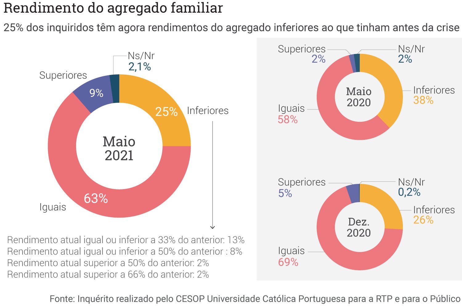 Neste universo de inquiridos que perderam rendimentos, 13 por cento dizem ter um rendimento atual igual ou inferior a 33 por cento do total de rendimentos anteriores. Oito por cento têm um rendimento igual ou inferior a 50 por cento do rendimento anterior à pandemia. Apenas quatro por cento dos inquiridos que perderam rendimentos têm agora um rendimento superior a 50 por cento em relação ao que auferia antes da crise pandémica.