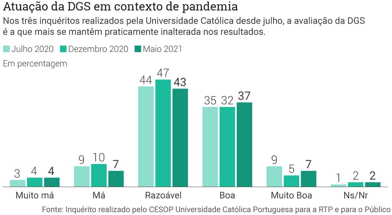 Nos três inquéritos realizados pela Universidade Católica desde julho, a Direção-Geral de Saúde é a que mais se mantêm praticamente inalterada nos resultados, com oscilações pouco significativas ao longo do último ano de pandemia.