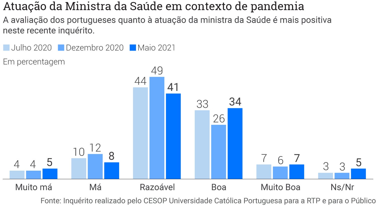 Tendo por base os inquéritos, há ainda portugueses que fazem uma avaliação “Má” (oito por cento) ou “Muito Má” (cinco por cento) da atuação de Marta Temido.