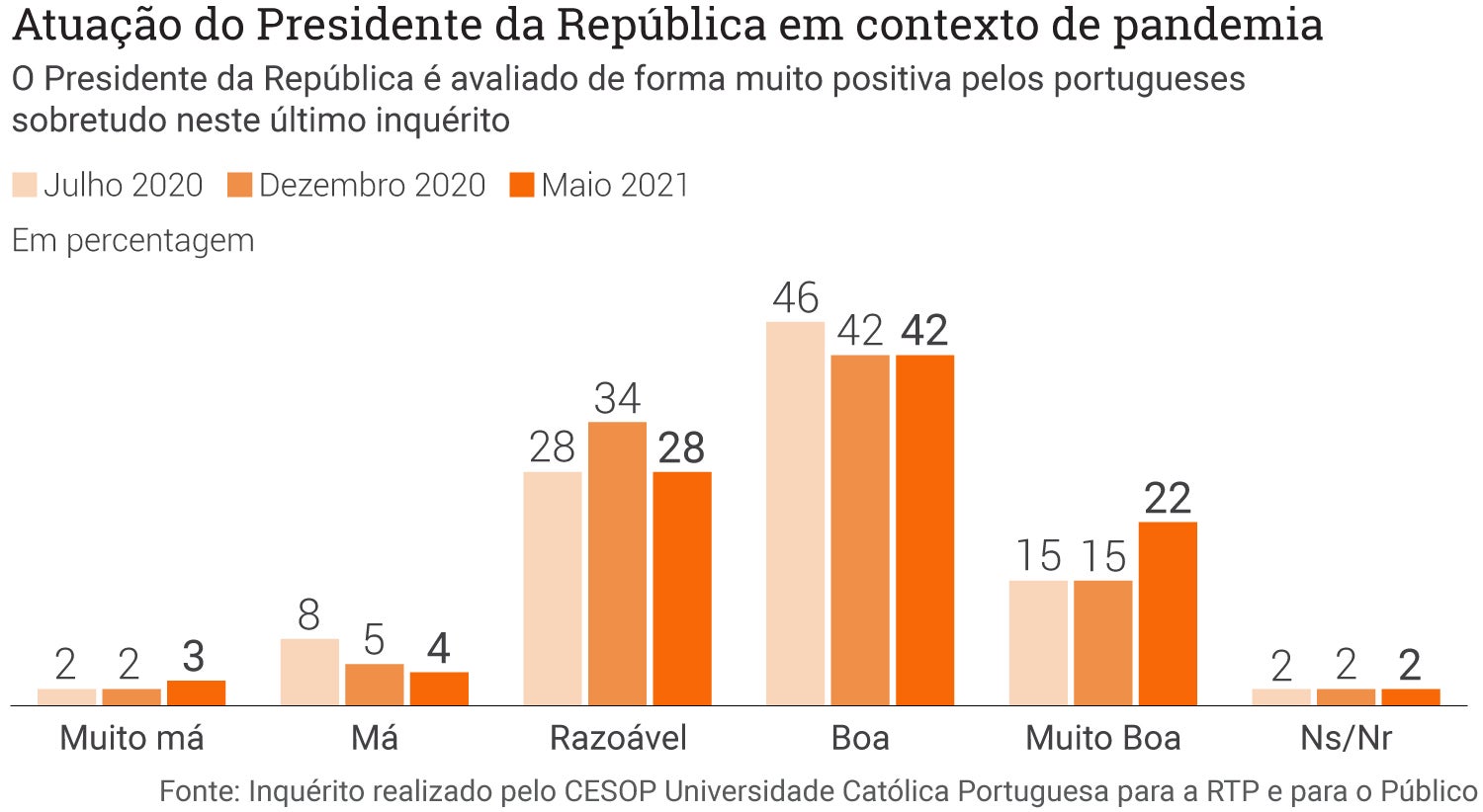 Na comparação com dados anteriores, o Presidente da República regista praticamente os mesmos dados em relação a dezembro e julho de 2020, com uma tendência para uma avaliação ainda mais favorável dos portugueses neste último inquérito. Nas sondagens anteriores, apenas 15 por cento classificava a atuação do PR como “Muito Boa”, número que é agora de 22 por cento.