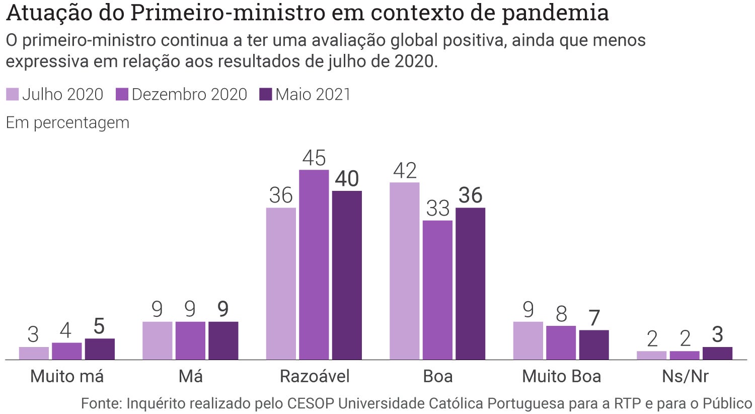 No campo político, o primeiro-ministro obtém uma avaliação “Razoável” por parte dos portugueses (45 por cento), enquanto 33 por cento consideram que a prestação de António Costa na resposta à pandemia foi “Boa” e oito por cento “Muito Boa”.