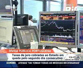 As taxas de juro cobradas ao Estado português nos mercados financeiros estão em queda pelo segundo dia consecutivo. Esta manhã, a taxa dos empréstimos do Tesouro a 10 anos estava nos 5,3%, depois de na quarta-feira ter chegado aos 6%. Os seguros comprados pelos investidores para se protegerem de uma eventual falta de pagamento de Portugal também estão agora mais baratos, o que quer dizer que o risco associado a Portugal está a descer, e isso acontece pelo terceiro dia seguido.