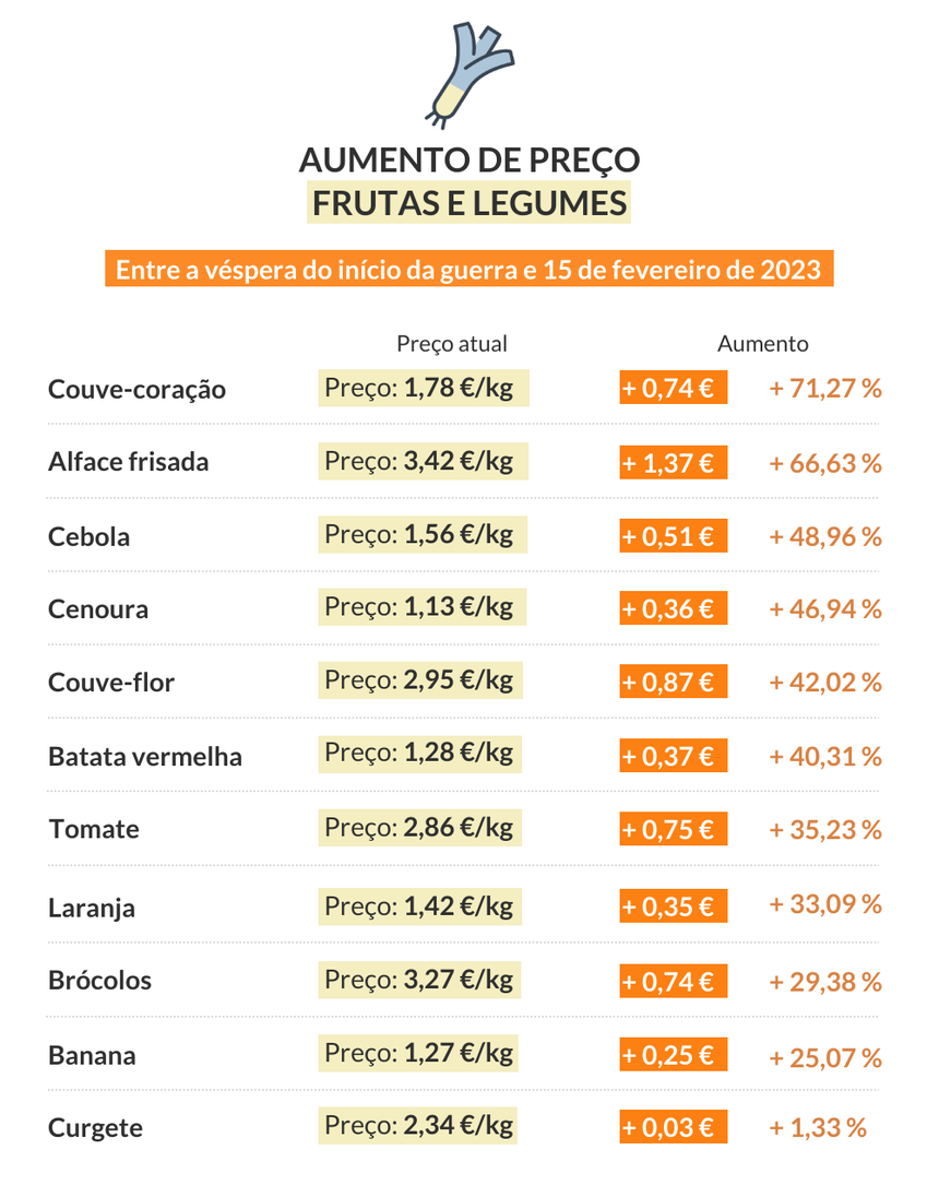 Segundo o relatório da DECO Proteste, um cabaz de bens alimentares essenciais custava 183,63 euros a 23 de fevereiro de 2022, um dia antes de a Rússia lançar a ofensiva contra a Ucrânia. Um ano depois, o mesmo cabaz com 63 alimentos essenciais custa 228,66 euros, mais 24,5 por cento. Segundo a Deco, este é o valor mais elevado desde que a Associação Portuguesa para a Defesa do Consumidor começou a monitorizar os preços do cabaz alimentar, a 5 de janeiro do ano passado.