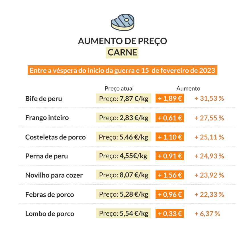 Uma ida ao talho fica agora a 39,60 euros, 22,81 euros mais caro do que antes da guerra. Em sete das variedades de carne incluídas no cabaz alimentar da DECO Proteste, cinco registaram aumentos acima dos 20 por cento. O bife de peru, as costeletas de porco e o frango inteiro foram os produtos que mais aumentaram nesta categoria.