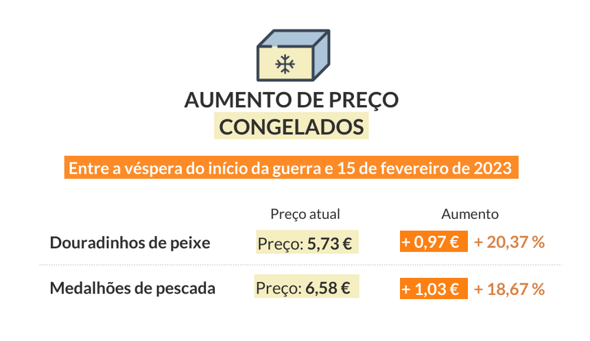 Já entre os congelados, o peso na carteira dos portugueses pode ser de 15,73 euros, mais 1,88 euros do que há um ano. Nesta categoria, os douradinhos foram o produto que mais viu o seu preço aumentar (mais 28,18 por cento face a 23 de fevereiro de 2022), custando agora 6,10 euros por embalagem. Os medalhões de pescada também então entre os congelados que mais aumentaram de preço, custando agora 6,58 euros, mais 18,67 por cento do que há um ano.