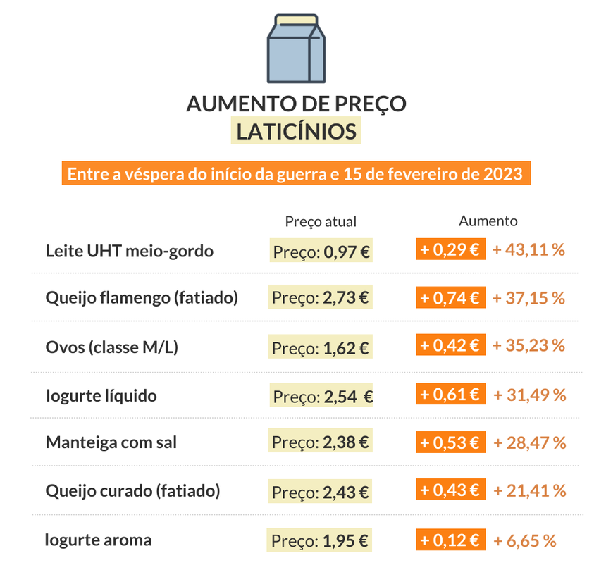 Nos laticínios, o aumento do preço do cabaz foi de 27,34 por cento, custando agora 14,61 euros. O leite UHT meio-gordo, o queijo flamengo fatiado e os ovos foram os produtos que mais subiram de preço nesta categoria.