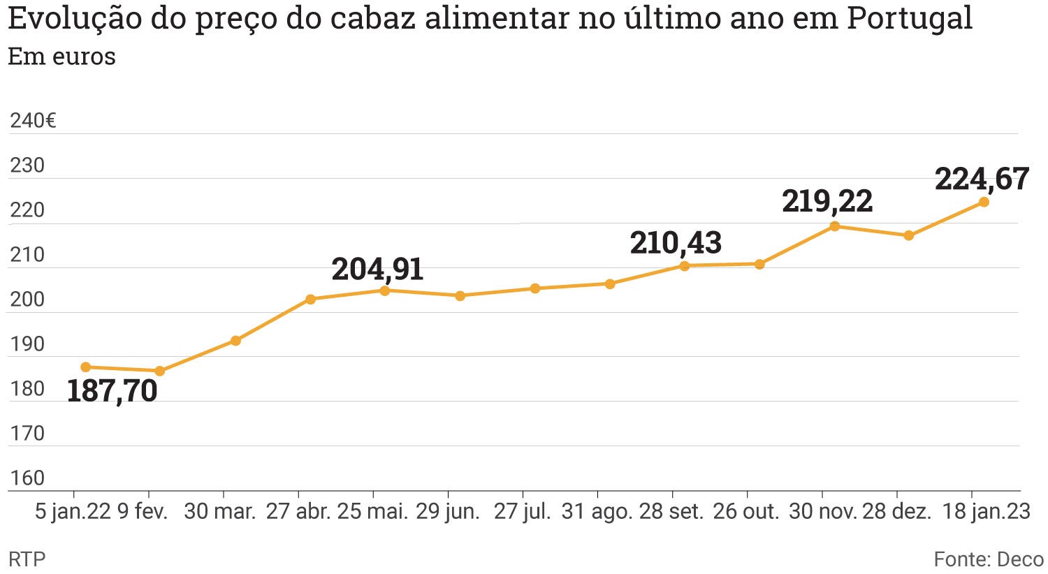 Estas subidas refletem-se no preço do cabaz de bens alimentares, que indica o orçamento mensal necessário para uma ingestão adequada de alimentos por uma pessoa saudável. Em janeiro de 2021, segundo dados da DECO, o valor do cabaz era 187,70€. Um ano depois, fixa-se em 224,67€.