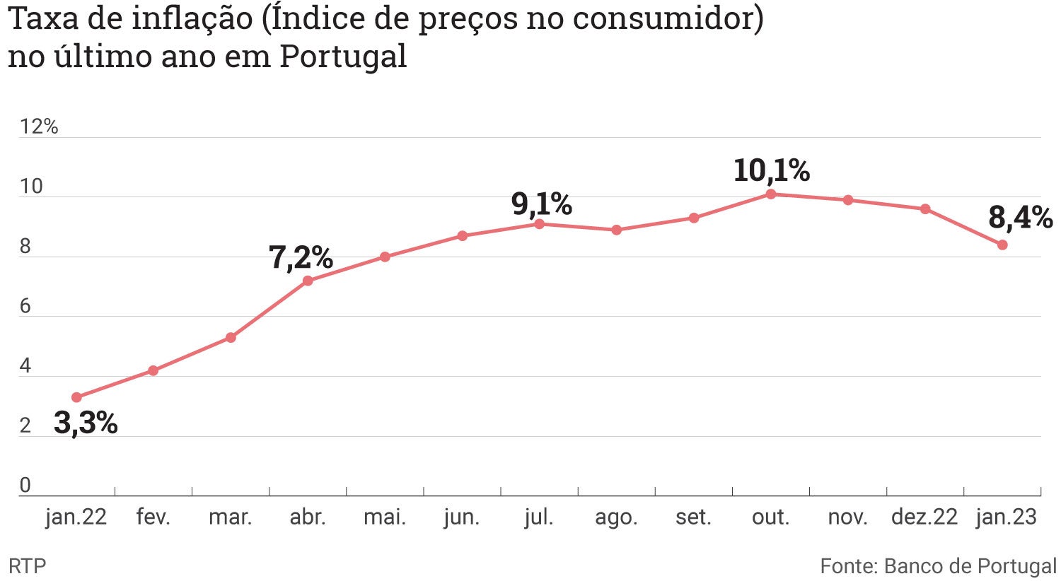 Em janeiro deste ano, o Instituto Nacional de Estatística apontou para uma inflação homóloga de 8,4%, referindo a subida dos preços dos bens alimentares como a principal causa do agravamento do custo de vida dos portugueses.
