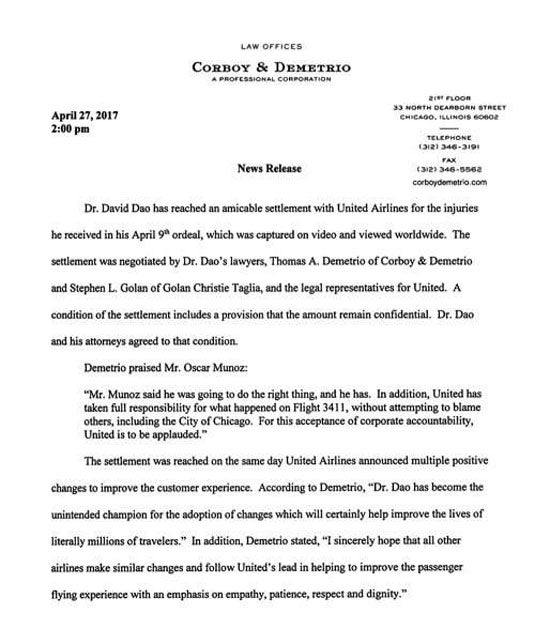 O advogado do médico, David Dao de 69 anos, Thomas A. Demetrio, anunciou que o seu cliente chegou a um acordo com a companhia. O valor da indeminização foi mantido confidencial.