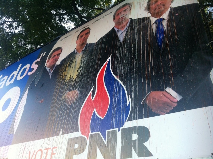 O PNR denuncia atos de vandalismo dirigidos ao único cartaz do partido, localizado na Praça do Saldanha. A comitiva do Partido Nacional Renovador realizou, esta tarde, uma ação de rua, procurando convencer os indecisos a votarem no PNR. E lamentaram o estado em que se encontra o cartaz.