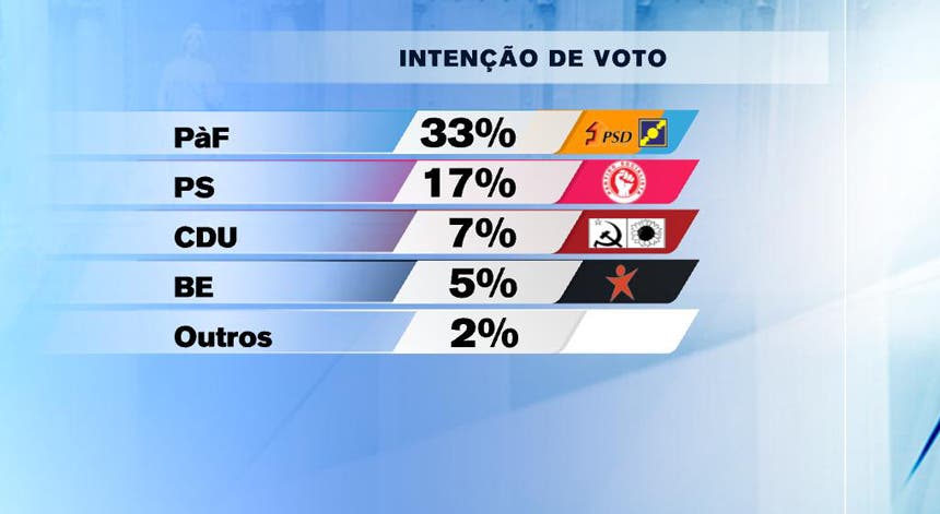 Outro dado a sobressair nesta oitava sondagem é o crescimento da coligação Portugal à Frente no capítulo da intenção direta de voto. A aliança entre as formações de Pedro Passos Coelho e Paulo Portas passa, neste plano, de 30 para 33 por cento, ao passo que o PS estagna nos 17 por cento.