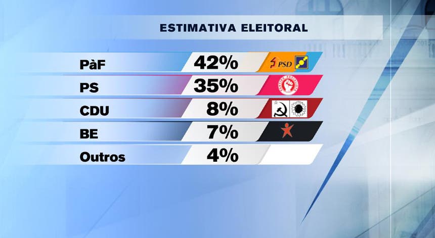 À esquerda do PS, a CDU perde um ponto, alcançando agora os oito por cento na estimativa de resultados. O BE mantém os mesmos sete por cento e os demais partidos não vão além dos quatro por cento.