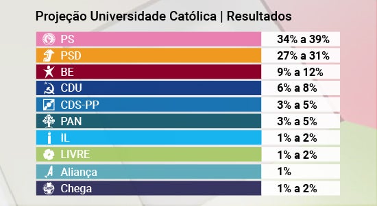 Os socialistas conquistam, de acordo com a projeção de resultados da Universidade Católica, entre 34 e 39% dos votos nestas eleições. Nas últimas legislativas, em 2015, o PS conseguiu 32,32%.