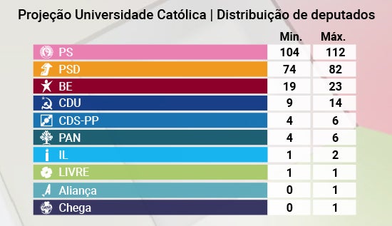 A projeção da Universidade Católica aponta para que o PS consiga eleger, no mínimo, 104 deputados e, no máximo, 112. Em 2015, os socialistas tinham 86 deputados.